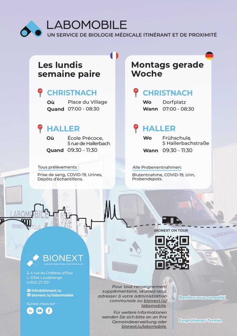 D’Gemeng informéiert dass vun e Méindeg, 15. Mee 2023 un d’Awunner d’Méiglechkeet hunn hir Analysen an eiser Gemeng am Labomobile vu BIONEXT ze maachen, den zweemol am Mount an eis Gemeng kënnt.