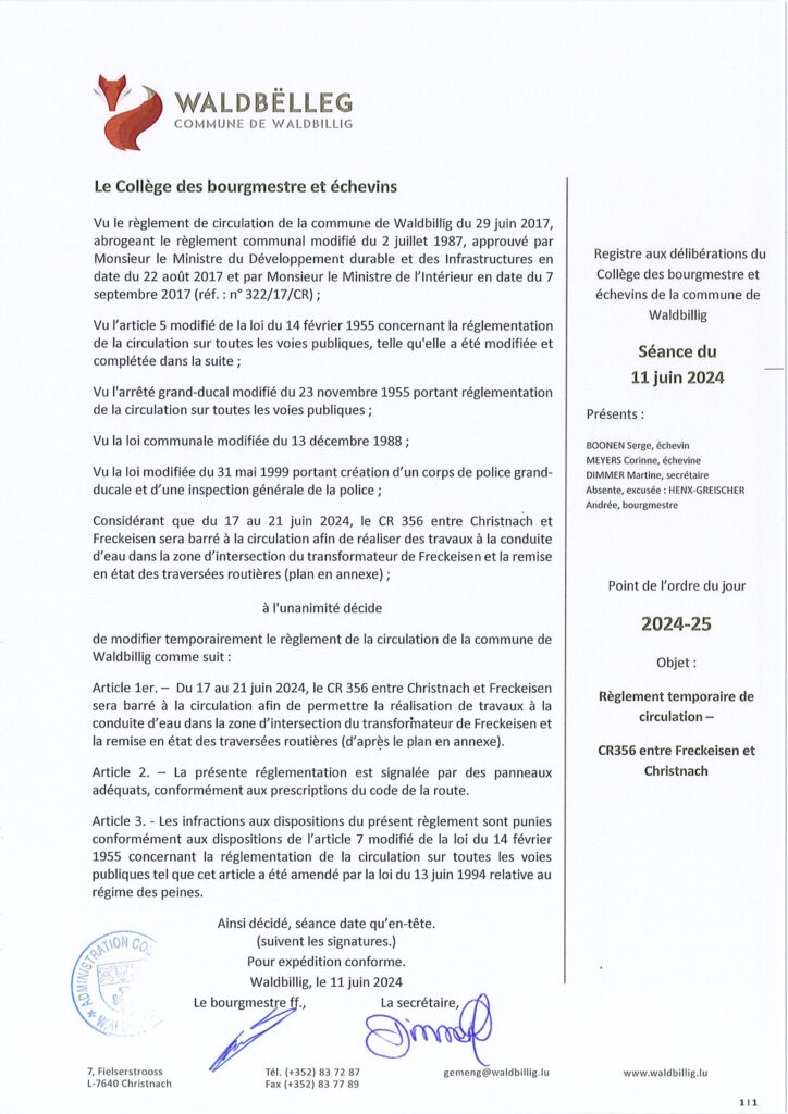 Règlement de circulation de la commune de Waldbillig Modification Nr4 10/2023