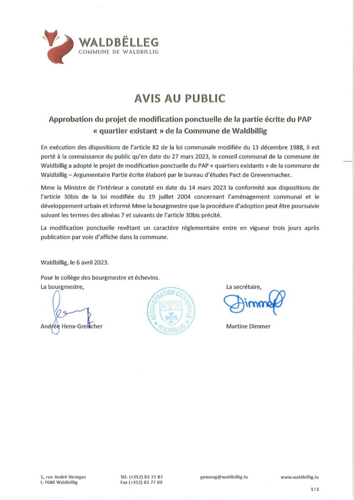 AVIS AU PUBLIC – Approbation du projet de modification ponctuelle de la partie écrite du PAP « quartier existant » de la Commune de Waldbillig