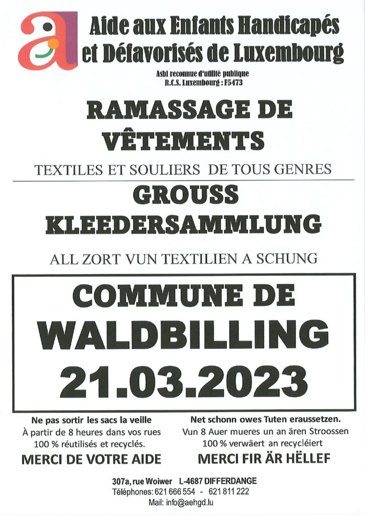 Ramassage de vêtements le 21.03.2023 à partir de 8:00h. Kleedersammlung den 21.03.2023 ab 8:00h.