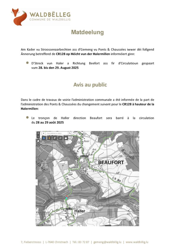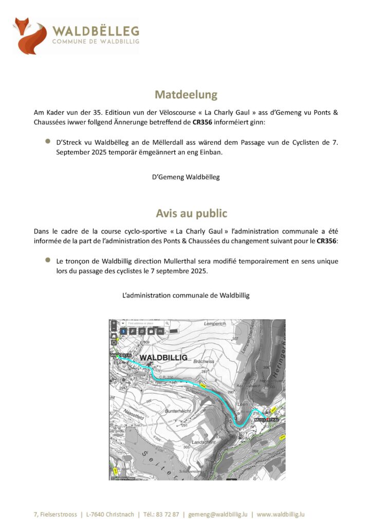 Avis au public – route barrée entre Waldbillig et Mullerthal